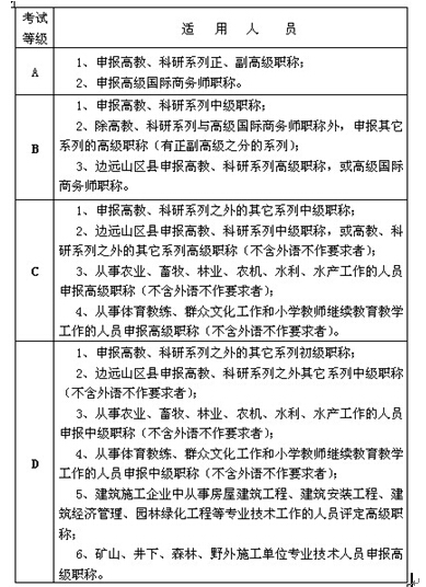 答:专业技术人员职称外语考试等级设置仍按A、B、C、D四个等级划分,各等级适用人员详见《四川省专业技术职称外语考试等级与适用人员对应表》。