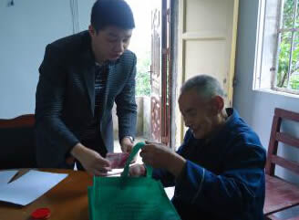 图二为:人社局慰问组同志为计生“三结合”户送上慰问金