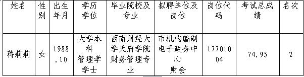 根据《宜宾市市属事业单位2017年第一次公开考调工作人员公告》规定及要求,通过笔试、面试、考察、体检等环节,经研究,拟调蒋莉莉同志到宜宾市机构编制电子政务中心工作,现予以公示:
