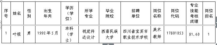 附:四川省宜宾市职业技术学校2017年下半年公开考核招聘工作人员拟聘用人员公示表