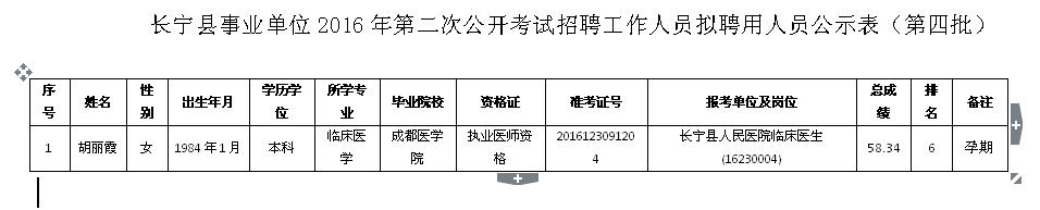 附件:长宁县事业单位2016年第二次公开考试招聘工作人员拟聘用人员公示表(第四批)