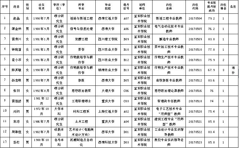 附:宜宾职业技术学院2017年上半年公开考核招聘拟聘用人员公示表