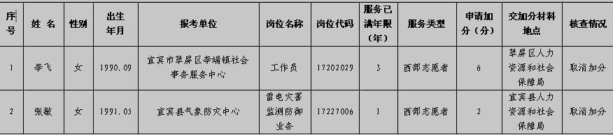 宜宾市事业单位2017年第二次公开考试招聘取消笔试加分情况汇总表