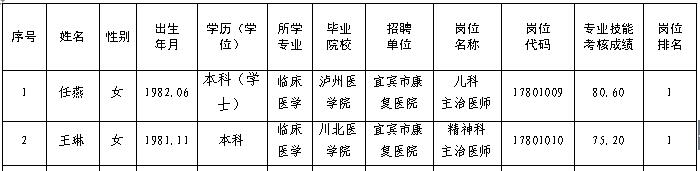 宜宾市康复医院2017年下半年公开考核招聘拟聘用人员公示表