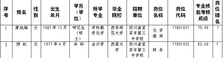 附:四川省宜宾市第三中学校2017年下半年公开考核招聘工作人员拟聘用人员公示表