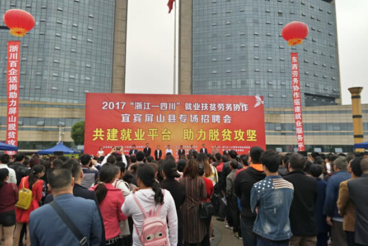 本网讯:为落实浙江省人力资源和社会保障厅和四川省人力资源和社会保障厅达成的劳务合作协议,做好2017年浙江对口援助宜宾市屏山县就业扶贫工作, 4月20日,川浙联合在宜宾市屏山县举办就业扶贫专场招聘会。
