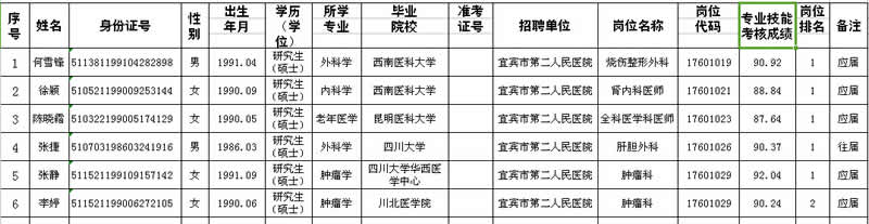 宜宾市事业单位2017年第一次公开考核招聘拟聘用人员公示表