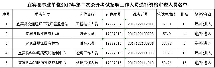 宜宾县事业单位2017年第二次公开考试招聘工作人员递补资格审查人员名单
