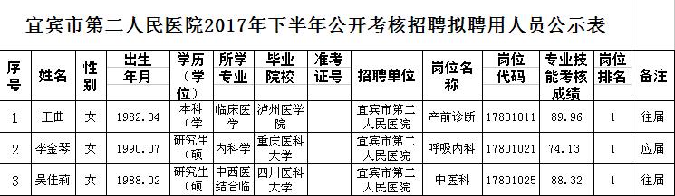 根据《宜宾市市属事业单位2017年下半年公开考核招聘工作人员公告》的规定,现将拟聘用人员予以公示。