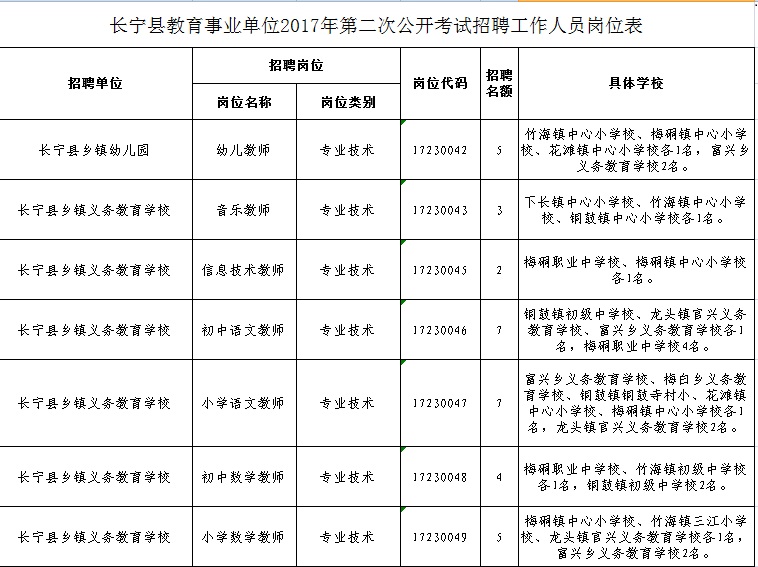 长宁县教育事业单位2017年第二次公开考试招聘工作人员岗位表
