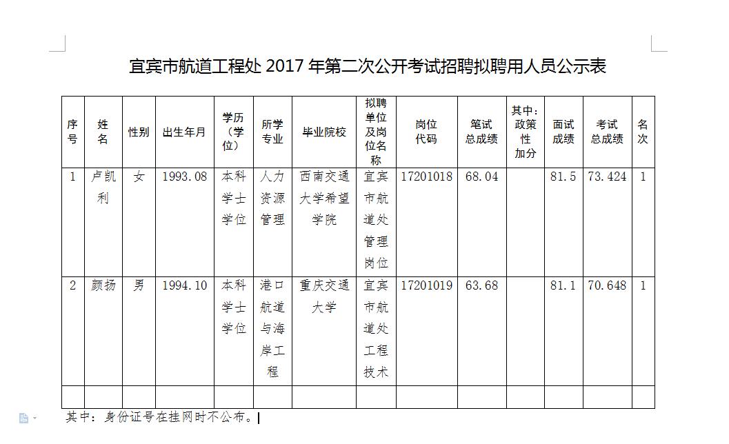附:宜宾市航道工程处2017年第二次公开考试招聘拟聘用人员公示表