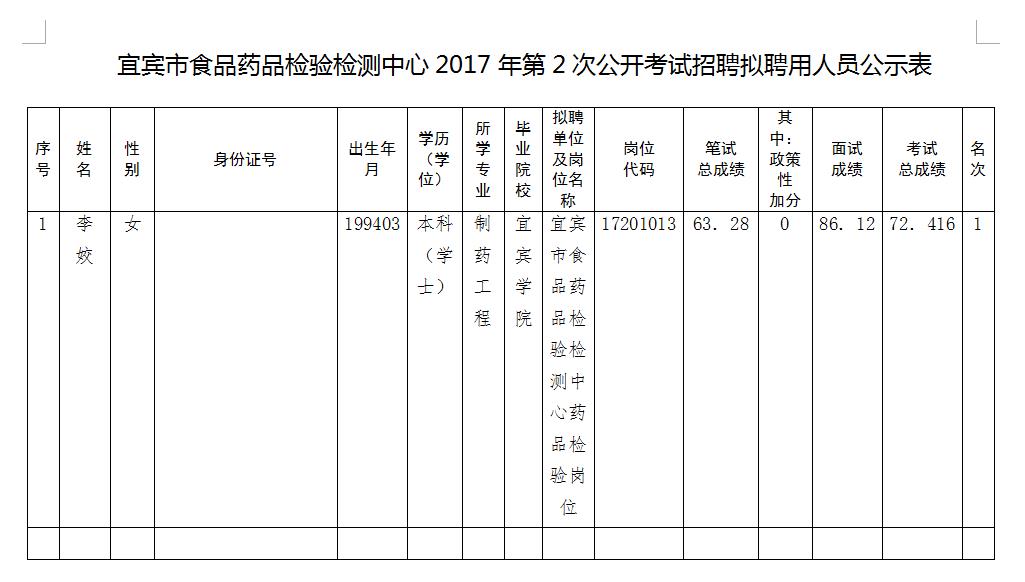 附:宜宾市食品药品检验检测中心2017年第2次公开考试招聘拟聘用人员公示表