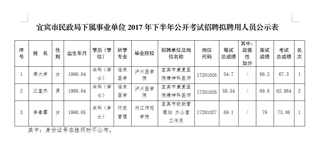 附:宜宾市民政局下属事业单位2017年下半年公开考试招聘拟聘用人员公示表