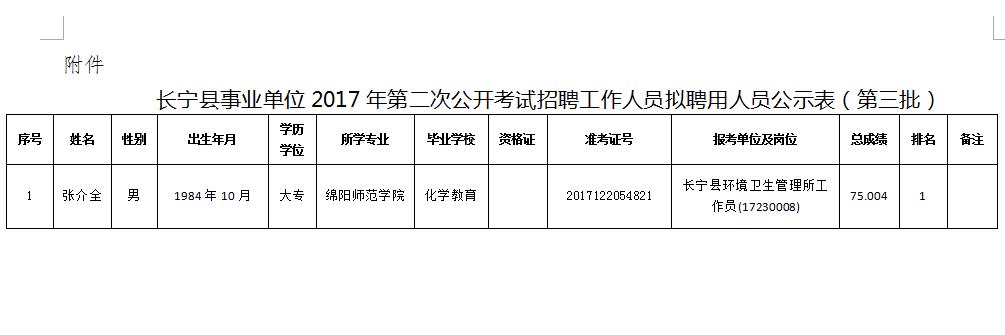 附件:长宁县事业单位2017年第二次公开考试招聘工作人员拟聘用人员公示表(第三批)
