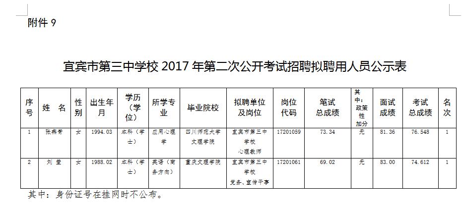 附:四川省宜宾市第三中学校2017年第二次公开考试招聘工作人员拟聘用人员公示表