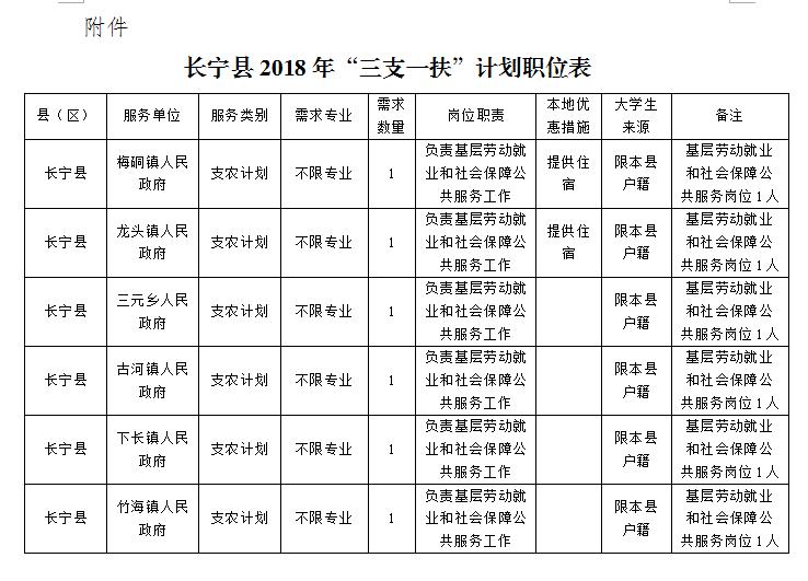 具体岗位要求见《长宁县2018年“三支一扶”计划职位表》(附件)。