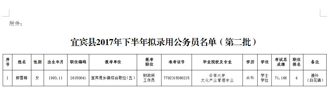 附件:宜宾县2017年下半年拟录用公务员名单(第二批)