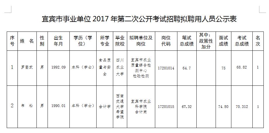 附:宜宾市事业单位2017年第二次公开考试招聘拟聘用人员公示表
