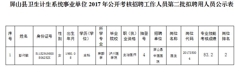 根据《屏山县卫生计生系统事业单位2017年公开考核招聘工作人员的公告》的规定,现将第二批拟聘用人员予以公示。